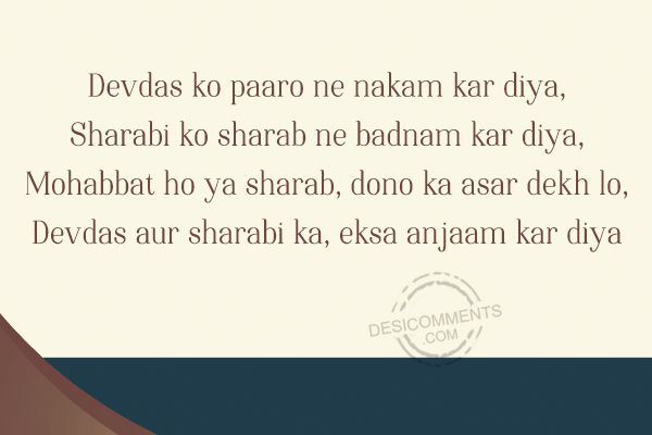 Devdas ko paaro ne nakam kar diya, Sharabi ko sharab ne badnam kar diya, Mohabbat ho ya sharab, dono ka asar dekh lo, Devdas aur sharabi ka, eksa anjaam kar diya